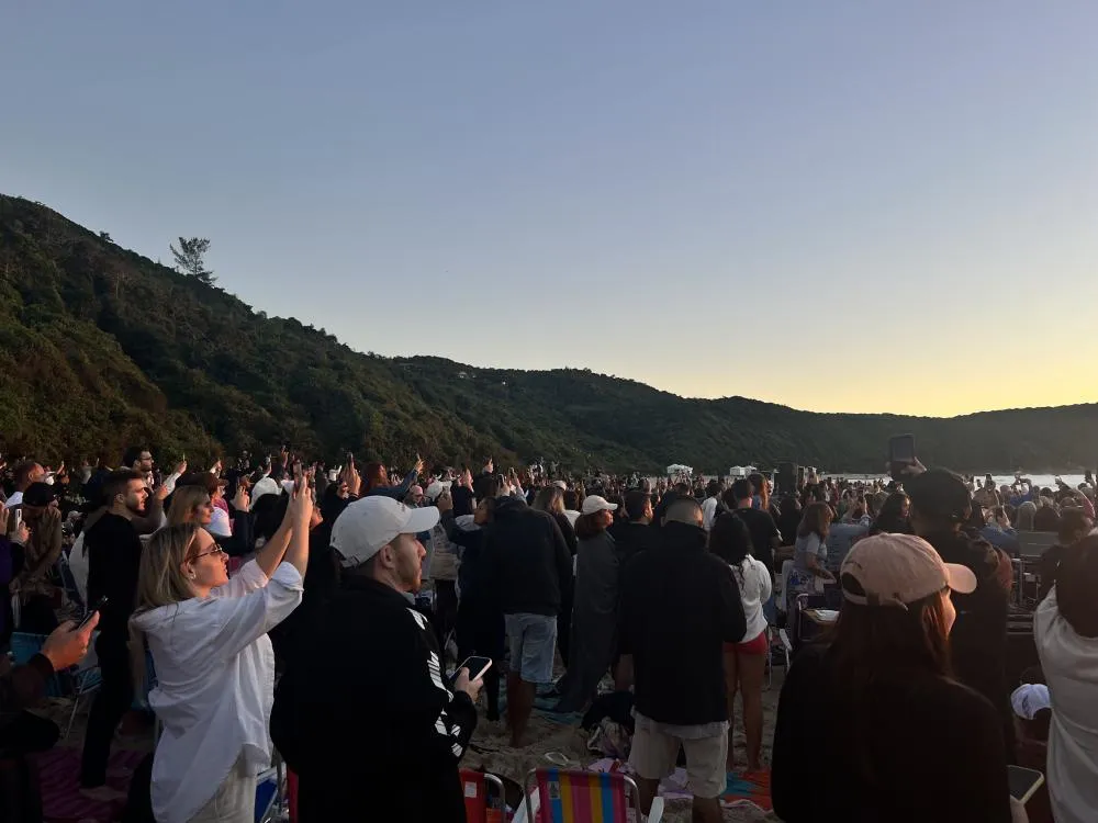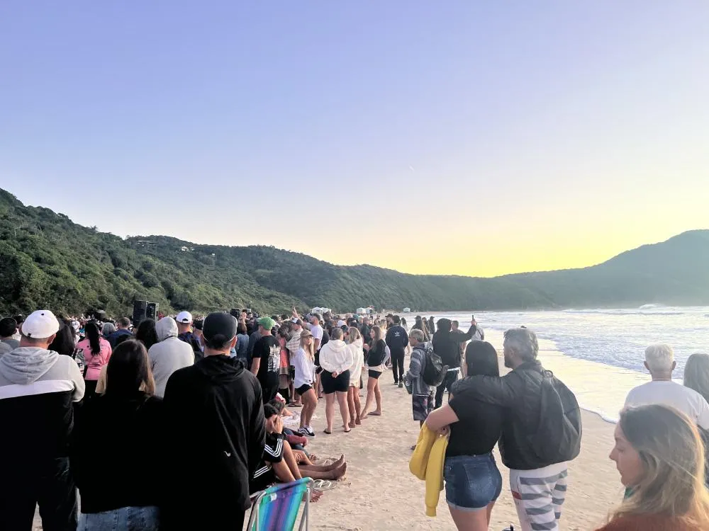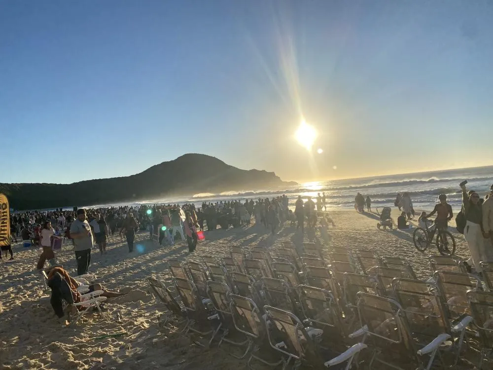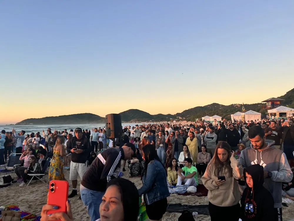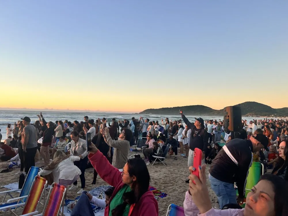 A manhã deste sábado (19) foi marcada por fé e comunhão na Praia do Rosa, em Imbituba. O evento “Resplandeça Rosa” reuniu dezenas de pessoas ainda antes do nascer do sol, no canto norte da praia, para um encontro religioso ao ar livre.
